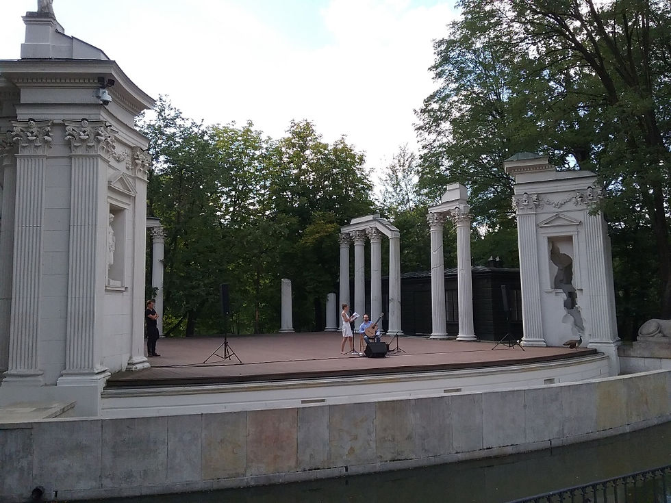 We then parted company with Grace and Paul and walked over the said bridge, grabbed a tram and after some confusion about where we were, grabbed another taxi and made it to Lazienski Park. This park covers 40 acres in the middle of the city and it was one of the most stunning parks I’ve ever seen. There were ponds, marble statues, majestic palace-like structures, flower beds, open air opera spaces, food trucks, amazing trees, swans etc… You name it, this park had it. We were actually there for a reason – every Sunday afternoon in summer, they have a free one hour piano recital underneath the sculpture of Warsaw’s most famous resident – Frederick Chopin. They’ve been doing this since 1959! An American/Polish pianist who recently won a Chopin competition played a grand piano under a shade cloth to about 2000 people. This concert was free and was absolutely amazing. The sun was fully out by now and we lay on the grass and half dozed off as we listened to this beautiful music. What a great hour!!